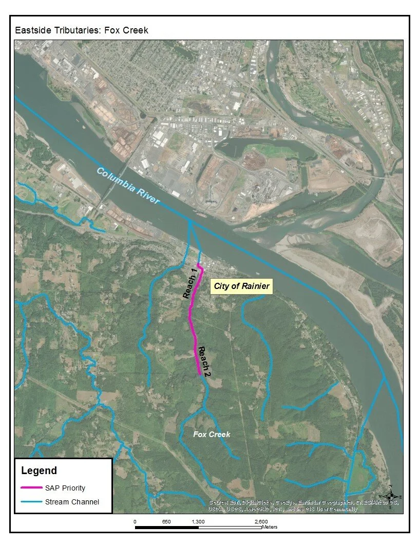 A geologically unique area representing the intersection of older basalt groups (~50 mya) as well as alluvium from Missoula flood events. Watersheds are smaller to medium size with predominantly steep slopes apart from Goble Creek. Goble creek is the largest sub watershed of this group with the highest proportion of unconfined floodplain. Fox Creek is unique in its location within the urban area of Rainier.